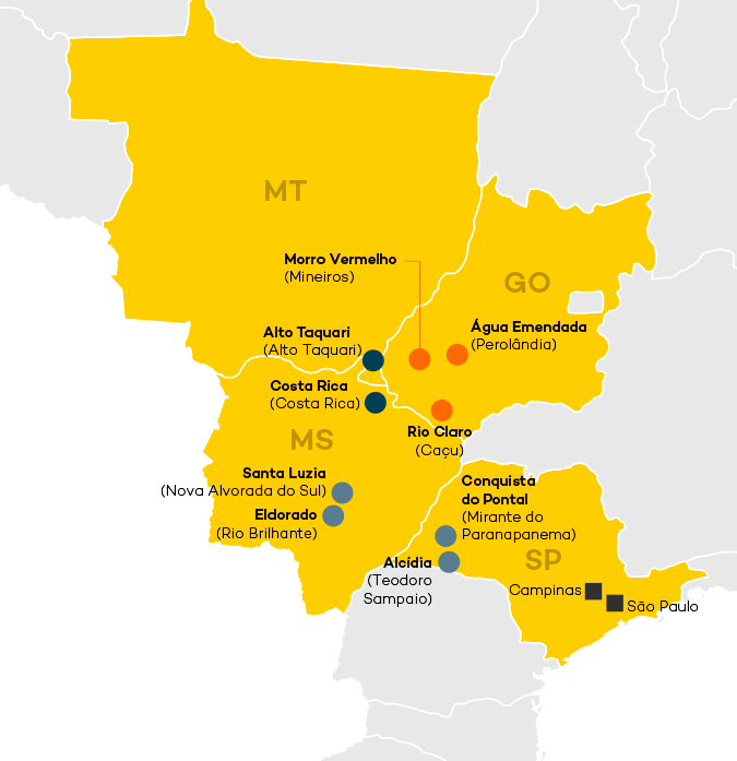 Unidade Alcídia*, em Teodoro Sampaio (SP); Unidade Eldorado, em Rio Brilhante (MS); e Unidade Santa Luzia, em Nova Alvorada do Sul (MS).
